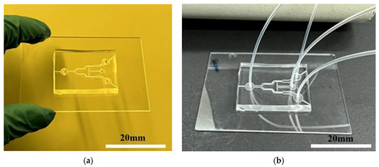 PDMS microchannel chips after PDMS–glass bonding using plasma treatment. (a) PDMS–glass chip sample; (b) chip sample connected with inlet and outlet piping.