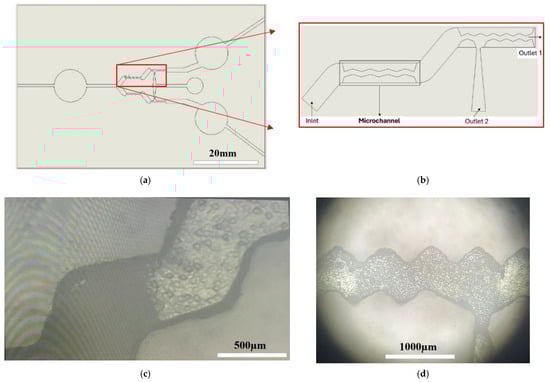 Figure 7 shows the use of the new process in this work. This example of fabricated PDMS microchannel chips with a 500 μm channel depth can be used for particle separation. Different from the authors’ prior work in ref. [28], the simplified zigzag microchannels shown in Figure 7b replaced the previous cilia microchannels. They also allow the particle flow to move in a wavy manner under the flow speed of 0.5~2.0 m/s and separate particles of different sizes into two outlets. Most of the bigger beads move to Outlet 1; the smaller beads move to Outlet 2. This zigzag microchannel contour is easier to fabricate using the laser cutting method presented in this work, and the particle separation efficiency is still similar to the prior cilia design. An Olympus OLS4100 3D confocal laser microscope was utilized to carry out the non-contact 3D-like observation of the particle separation experiment. The filling solution needed for the test is mixed using 200 mL of water and 2 g of micro-silica dimer SiliaFlash® C60 (SiliCycle Inc., Quebec City, QC, Canada), which have particles that range in size from 5 to 20 µm. A KdScientific KDS-100 syringe pump was used to drive the filling flow. Figure 7c,d depict particle aggregation at different places inside the microchannel after 3 min of the filling flow experiment. More detailed results regarding separation and discussion will be mentioned in the authors’ future papers.