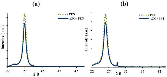 X-ray diffraction patterns of (a) AZO/PEN and PEN substrate, and (b) AZO/PET and PET substrate.