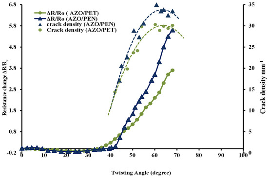 As the twisting angle increases further, the density of cracks also increases correspondingly. In both scenarios, the electrical resistance increases, which is consistent with the results of prior research [14,22] concerning the deposition of thin ceramic coatings onto flexible substrates. As illustrated in Figure 5, this increase in resistance is due to the applied load-induced formation of cracks, which correlates with the film’s cohesive strength. The resistances of AZO/PEN and AZO/PET increase at twisting angles of approximately 43.6° and 39.4°, respectively, which are indicative of fracture initiation (see Figure 5). Furthermore, a higher saturated fracture density was noted in AZO/PEN samples relative to AZO/PET samples. This suggests that when AZO is applied to a highly rigid polymer substrate, it generates a greater number of cracks in an effort to relieve the applied stress. On the contrary, stress concentration can result in the establishment of debonding between a less rigid polymer substrate and AZO, whereby the stress is absorbed by the polymer substrate within the debonded region. Tsubone [23] has previously documented comparable results pertaining to the application of diamond-like carbon coatings onto polymer substrates.