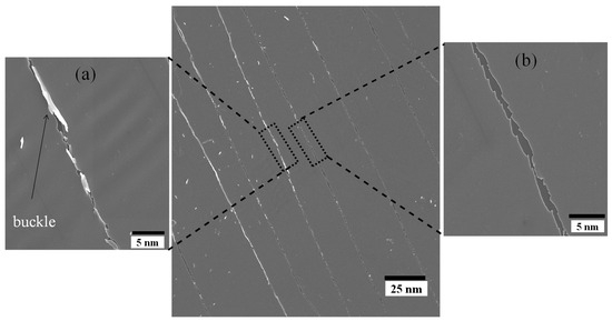 Further insight into the failure mechanisms of the AZO thin film is provided by ex situ scanning electron microscopy. For example, as depicted in Figure 7a, the film experiences complete separation in certain areas due to the formation of wide cracks. However, in other areas, overlapping film and buckling delamination of the multilayer-stacked AZO thin film from the substrate are observed, as shown in Figure 7b. This observation is consistent with the alteration in electrical resistance data observed after reaching the crack saturation point.
