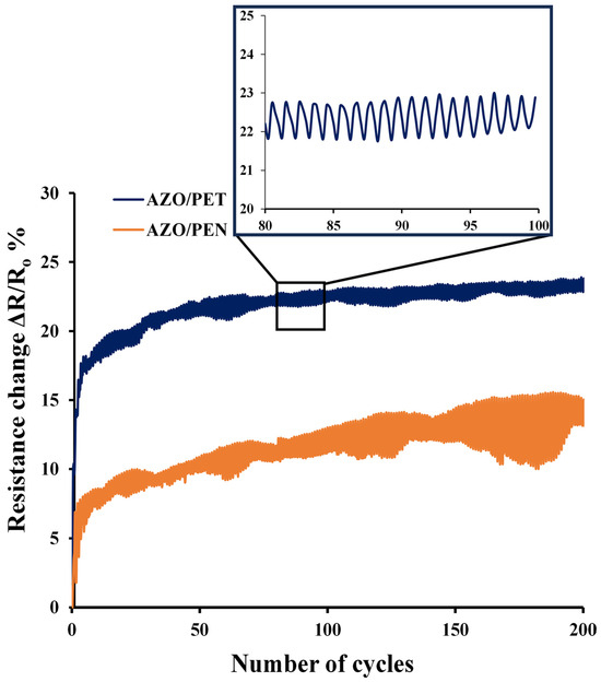 Twisting fatigue tests were conducted for 200 cycles at a frequency of 12 s per cycle, with a consistent twisting angle of 22.5 degrees. Figure 8 illustrates that the resistance varied depending on the number of cycles for both AZO/PEN and AZO/PET samples. After the first few cycles, there was a significant rise in normalized electrical resistance, stabilizing at the 10th cycle for both samples. This may be attributed to the dimensional change in the polymer substrate [24,25]. Resistance changes eventually stabilized and then steadily increased with more twisting cycles applied.