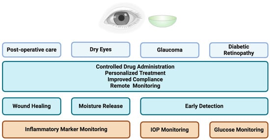Therapeutic applications of smart contact lens (SCLs). SCLs can play an important role in the management and monitoring of patients in post-operative care, dry eyes, glaucoma, and diabetes. Made with permission from Biorender.