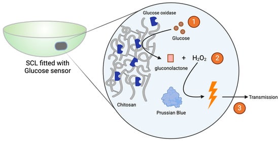 Park et al. (2024) recently developed an SCL glucose biosensor that was able to transmit information wirelessly to the user’s smartphone []. The group demonstrated an in vivo correlation between tear glucose and blood glucose. Glucose monitoring was facilitated by a working electrode and counter/reference electrodes that were embedded in the contact lenses and exposed to tear fluid. The working electrode was coated with glucose oxidase that was immobilized in a matrix composed of chitosan. Glucose oxidase converted glucose into gluconolactone and hydrogen peroxide. Hydrogen peroxide was reduced through the presence of Prussian blue, acting as an artificial peroxidase on the working electrode to release electrons, and a current was created that was proportional to the concentration of glucose in the tears (Figure 2). The group’s design was also equipped with near-field communication (NFC) capabilities to transmit glucose data in real time.