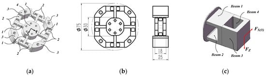 Based on the classic Maltese cross elastic element, a compact strain elastic element with double-layer cross floating beam is designed in this paper. The overall structure is shown in Figure 2a. Figure 2b shows the dimensions of the structure, with a maximum outer diameter of only 75 mm and a maximum thickness of 25 mm. Figure 2c shows the double-layer cross floating beam of the strain elastic element, which is the force-measuring unit of and . It improves the stiffness of the overall structure while ensuring sensitivity.