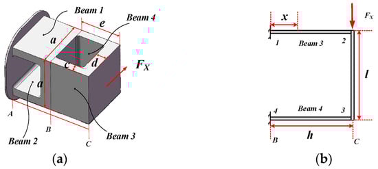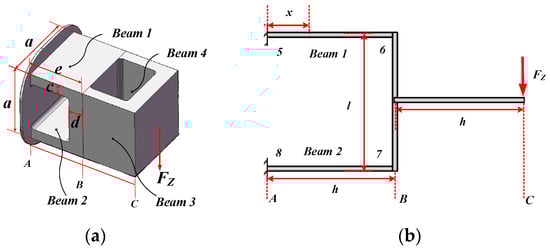 The double-layer cross floating beam is the force measuring unit of and on the strain elastic element. It is not enough to obtain the finite element solution of the strain and deformation of the double-layer cross floating beam under loading by using finite element software, but also to establish a static model. Assuming that the elastic element is ideal, the geometric shape and size of the structure are completely symmetrical on the X-axis and Y-axis. When the same force () is applied to the elastic element along the X-axis or Y-axis, the strain and deformation of the elastic element along the X-axis and Y-axis are the same. Therefore, it is only necessary to analyze the strain and deformation generated by (or ) and .