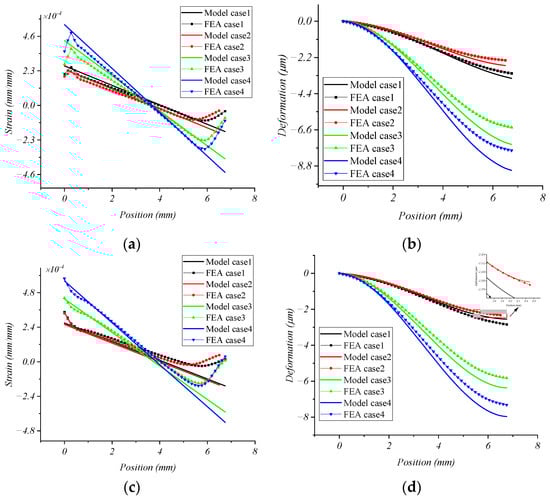 Comparison between FEA solution and model solution for strain and deformation of double-layer cross floating beam. (a) Beam strain under loading; (b) beam deformation under loading; (c) beam strain under loading; (d) beam deformation under loading.