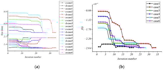 The materials AISI 1045 and = 80 N are selected as an example to optimize the structural parameters. In order to ensure that the global optimal solution is found, six groups of initial design variables are set up for calculation, respectively, as shown in Table 3. The iteration history of each case is shown in Figure 6.