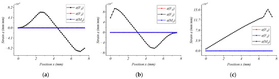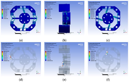 Figure 9a–c show the strain of the corresponding bridge circuit when the strain elastic element is subjected to = 500 N, = 500 N, and = 20 Nm, respectively. This result can provide a reference for subsequent calibration tests and circuit design.
