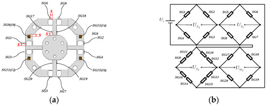 The strain gauge for detecting is SG(1–4), the strain gauge for detecting is SG(5–8), the strain gauge for detecting is SG(9–16), and the strain gauge for detecting is SG(17–20). All strain gauges form four Wheatstone bridges for measurement, as shown in Figure 8b. The relationship between strain ɛ and bridge output voltage can be expressed as follows [18]: