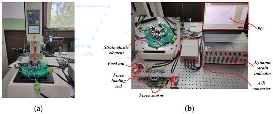 In order to determine the calibration matrix S, a static calibration test is performed using the method shown in Figure 10. Figure 10a shows the Z-direction calibration of the strain elastic element, and the force sensor used is HP-1000 (Yueqing Handpi Instruments Co., Ltd. Zhejiang, China). Figure 10b shows the X, Y, and MZ direction calibration of the strain elastic element, and loading in different directions is achieved by changing the action direction and action point of the two force sensors on the force loading rod. The increase and decrease in the loading force are achieved by the screw and feed nut connected to the force sensor. The force sensor is ZNLBS-V1 (Bengbu Chino Sensor Co., Ltd. Anhui, China).