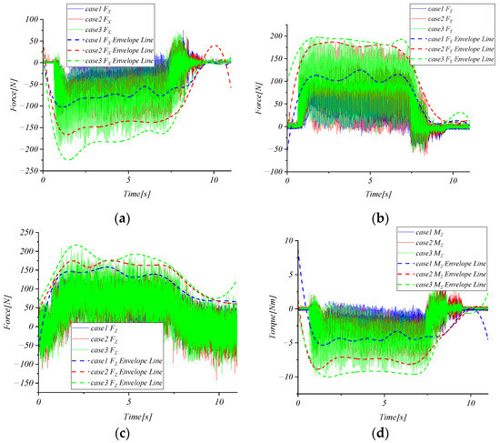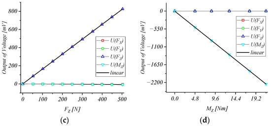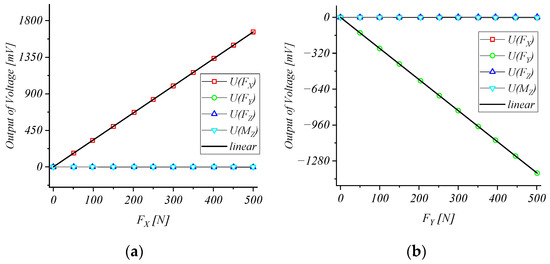 The performances of the strain elastic element obtained according to the calibration tests are shown in Table 5. The calibration results show that the sensitivities of the designed strain elastic element in the , , , and directions are 3.3 mV/N, 2.7 mV/N, 1.6 mV/N, and 104.1 mV/Nm, respectively. The maximum cross-sensitivity error is 0.63%, which is lower than 1% and meets the usage requirements [21].