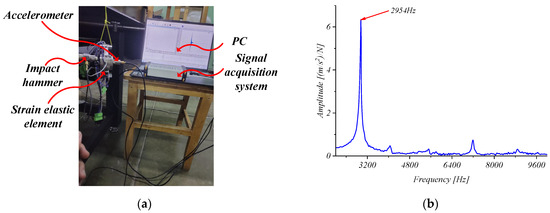 Since machining is a dynamic process, the natural frequency of the strain elastic element must be considered. In order to determine the natural frequency of the elastic element, free mode tests were performed using the natural frequency test system YE6231C (SNOCERA PIEZOTRONICS Co., LTD. Jiangsu, China), as shown in Figure 12a. The accelerometer was fixed on the structure and excited by an impact hammer.
