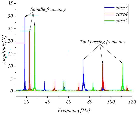 In Figure 14, by comparing the cutting force and envelope results of case 1, 2, and 3, it can be seen that the cutting force collected by the strain elastic element increases with the increase in cutting depth, indicating that the strain elastic element can obtain the change in cutting force. Figure 15 shows the amplitude–frequency characteristics of the cutting force of cases 4, 5, and 6. The spindle frequency and tool-passing frequency of the three tests are 18.45 Hz, 73.82 Hz, 23 Hz, 92.18 Hz, 27.73 Hz, and 110.8 Hz, respectively. The results show that the strain elastic element can obtain the spindle frequency and tool-passing frequency.