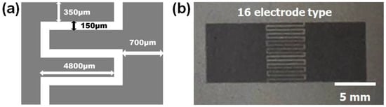 (a) Dimensions of the interdigitated micro-pattern obtained through LSC and (b) an actual digital image of interdigitated micro-pattern with 16 electrodes obtained through LSC.