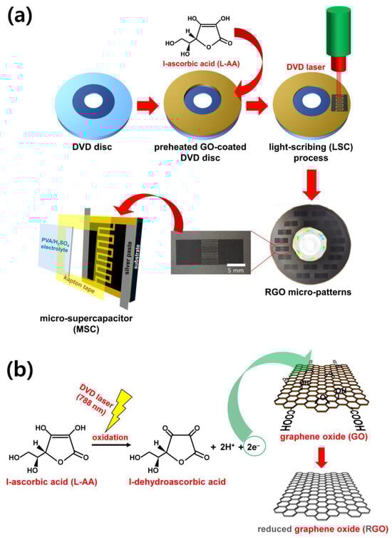 Despite the advantages of the LSC process mentioned above, the LSC method has several disadvantages. First of all, since the intensity of the 788 nm laser, which is the light source of the DVD writer, is not strong, it is difficult to achieve the desired degree of GO reduction with only one LSC process [,,,,,]. For this reason, repeating the LSC process several times or more is often necessary to realize the desired electrical and electrochemical properties. In addition, even if the LSC process is performed using the same DVD writer, deviations in the surface resistance and electrochemical activity of the micro-patterns inevitably occur depending on the deviations in the physical properties of the GO used. Recently, the eco-friendly reduction process of GO using green reducing agents, including l-ascorbic acid, metallic zinc, and sugar, has attracted great interest [,]. The reason is that these reducing agents are less harmful to the human body and are effective in converting GO into conductive RGO. In particular, L-AA has a photosensitive property that is oxidized when stimulated by UV–visible light, and the electrons released when L-AA is oxidized effectively reduce GO’s oxygenated functionalities []. Since this photosensitive oxidation reaction of L-AA works well even in a 788 nm light source generated from a DVD burner, the overall reduction efficiency of graphene through the LSC process is improved. In addition, the presence of L-AA is considered to shorten significantly the time required for the pre-reduction process of GO. Although several studies on the green reduction of GO using L-AA have been reported, studies applying the advantages of L-AA in the LSC process have not been reported. Therefore, developing the LSC process in the presence of L-AA is worthwhile for optimizing the conditions to produce high-quality graphene micro-patterns and MSCs within a shorter time.