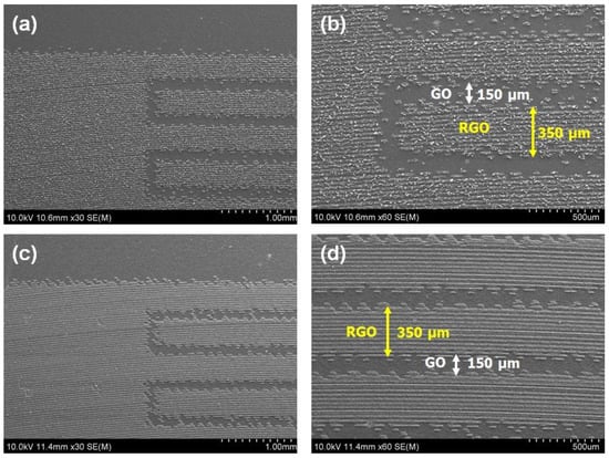 Figure 3 shows the FE-SEM images of the graphene micro-pattern obtained after the LSC process was performed one and five times. Even through one time of LSC, it was successful in fabricating an interdigitated micro-pattern with an electrode width of 350 μm and an inter-electrode spacing of 150 μm (Figure 3a,b). However, the connectivity between the RGO lines inside an electrode remained low (Figure 3b). As a result of increasing the time of LSC to five times, the width of the electrode and the distance between the electrodes were kept constant, while the connectivity between the RGO lines constituting one electrode was remarkably improved (Figure 3c,d). The FE-SEM images presented in Figure S1 offer a detailed overview of how the morphology of the graphene micro-pattern surface is affected by different LSC treatment times. As the number of LSG treatments increased from nought to five, RGO lines began to form, and the gap between them gradually decreased (Figure S1a–f, see Supplementary Materials). After the five times of LSC treatments, the connectivity between RGO lines reached its maximum (Figure S1e, see Supplementary Materials). Beyond the five times of LSC treatments, no further changes were observed in the connectivity between RGO lines (Figure S1f, see Supplementary Materials). The improved connectivity between the RGO lines inside the electrode means a decrease in contact resistance due to the improvement of the conductive channels inside the micro-pattern. Therefore, our work determined that the optimal number of printing times to maximize electrical properties while maintaining a constant resolution of micro-patterns was five times.