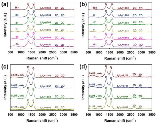 Raman spectra of graphene micro-patterns fabricated (a) before and (b) after performing the LSC (5 times) of pretreated graphene under different heat-treatment times. Raman spectra of graphene micro-patterns fabricated (c) before and (d) after performing the LSC (5 times) of graphene pretreated with different molarity of L-AA.
