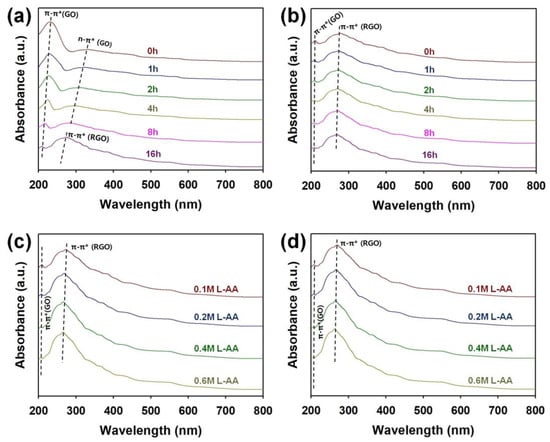 Figure 5 shows the UV–visible spectra of graphene micro-patterns obtained under different heat-treatment times, L-AA concentrations, and times of LSC. As the heat-treatment time increased, the absorption peaks corresponding to the π–π* electron transition of GO and the n–π* electron transition of GO moved to shorter wavelengths and decreased in intensity (Figure 5a) [,]. Conversely, the intensity of the absorption peak corresponding to the π–π* electron transition of reduced graphene oxide (RGO) gradually increased with longer heat treatment, indicating that a higher degree of reduction leads to the removal of more oxygen functional groups, decreasing the oxygen atoms that can cause the n–π* electron transition [,]. After five times of LSC process, the intensity of the peaks increased only slightly (Figure 5b). As a result of reducing the heat-treatment time to 15 min and increasing the content of L-AA, it was confirmed that the blue shift of the absorption peak corresponding to the π–π* electron transition of RGO and the increase in absorbance intensity became more prominent (Figure 5c). Even after five times of LSC processes, the increase in the peaks corresponding to RGO was minimal, suggesting that the reduction effect by the heat-treatment process accompanied by L-AA before LSC was significant (Figure 5d).