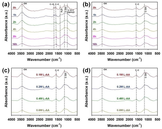 FT-IR spectra of graphene micro-patterns fabricated (a) before and (b) after performing the LSC (5 times) of pretreated graphene under different heat-treatment times. FT-IR spectra of graphene micro-patterns fabricated through (c) before and (d) after performing the LSC (5 times) of graphene pretreated with different molarity of L-AA.