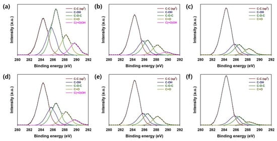 The C1s XPS spectra of the graphene samples prepared under different conditions were studied to analyze the bonding structure of the prepared graphene samples (Figure 7 and Table 1). The oxygenated carbon groups in pristine GO (0 h heating) accounted for 74.2% of the total, and the sp2-hybridized C=C bond accounted for only 25.8%. This indicates that most of the carbons that make up pristine GO are sp3-hybridized (Figure 7a and Table 1) [,,,,,,,]. It was confirmed that the proportion of sp2-hybridized C=C bonds contained in the sample preheated with GO for 16 h and the sample with GO preheated under 0.6 M L-AA for 15 min increased to 49.3 and 63.3%, respectively (Figure 7a,b and Table 1). Furthermore, it was found that the carboxylic acid groups completely disappeared after heat treatment of graphene in the presence of 0.6 M L-AA for 15 min. These results demonstrate that the reduction effect using L-AA is much more efficient than GO reduction through heat treatment for 16 h [,,,,,,,]. After five times of LSG treatments, the proportion of sp2-hybridized C=C bonds contained in graphene materials increased as follows: 0 h heating (42.1%) < 16 h heating (58.6%) < 0.6 M L-AA (70.4%) (Figure 7d–f and Table 1). Considering the above facts, it was possible to prove through XPS C1s spectra that the presence of 0.6 M L-AA was very effective in improving the reduction effect through the LSG process, and it perfectly matched the tendency of the Raman spectra shown in Figure 4 [,,,,,,,].