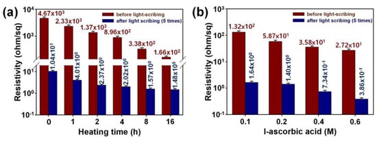 In order to identify the effects of heat-treatment time, L-AA concentration, and LSC on the electrical properties of graphene micro-patterns, the surface resistivities of the samples are summarized in Figure 7. As the heat-treatment time increased, the surface resistance of graphene significantly decreased, and the surface resistance of the sample heat-treated for 16 h (1.66 × 102 Ω/sq) was reduced by 28.1 times compared to pristine GO (4.67 × 103 Ω/sq) (Figure 8a). In addition, when LSC (five times) of the sample heat-treated for 16 h was performed, it was found that the surface resistance decreased by 112.2 times (1.4867 × 100 Ω/sq) compared to before the LSC process (1.6667 × 102 Ω/sq). Furthermore, when LSC was performed on the sample heat-treated for 16 h, the surface resistance decreased by 112.2 times (1.4867 × 100 Ω/sq). The LSC process was found to be highly effective in enhancing the degree of GO reduction, leading to significantly improved electrical properties of graphene micro-patterns [,,]. The surface resistivities of the graphene samples treated with heat for 15 min in the presence of L-AA were 10 to 100 times lower than those subjected to heat treatment for a long time without L-AA (Figure 8b). Notably, the resistance of graphene pretreated with 0.6 M L-AA (2.7267 × 101 Ω/sq) was 171.7 times lower than that of pure GO, and this decreased further by 6.10 times (3.8667 × 10−1 Ω/sq) after the LSC process was performed 5 times. The involvement of L-AA in the reduction of GO during the LSC process was found to restore the sp2-hybridized carbon structures and expand the conjugated system structure, thereby promoting the delocalization of electrons [,,]. Considering these results, pretreating GO through heat treatment for 15 min in the presence of 0.6 M L-AA is more effective in enhancing the LSC efficiency than pretreating GO through heat treatment for 16 h, facilitating the production of graphene micro-patterns with improved electrical properties.