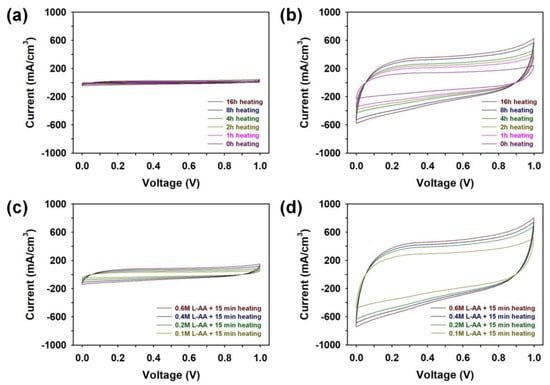 Cyclic voltammograms (CVs) of MSCs fabricated (a) before and (b) after performing LSC process (5 times) of pretreated graphene under different heat-treatment times. CVs of MSCs fabricated through (c) before and (d) after performing LSC process (5 times) of graphene pretreated with different molarity of L-AA. These CV curves were measured at a scan rate of 10 mV/s.