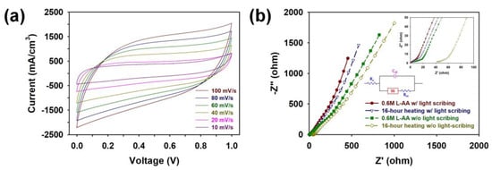 (a) CV curves of an MSC containing a graphene micro-pattern prepared by the LSC process (5 times) in the presence of 0.6 M L-AA measured at different scan rates. (b) Nyquist impedance plots of MSCs containing graphene micro-patterns prepared under different manufacturing conditions in the frequency range from 1 MHz to 10 mHz.