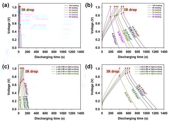 Galvanostatic charge–discharge (GCD) curves of MSCs fabricated (a) before and (b) after performing the LSC process (5 times) of pretreated graphene under different heat-treatment times. GCD curves of MSCs fabricated (c) before and (d) after performing the LSC process (5 times) of graphene pretreated with different molarity of L-AA. These GCD curves were measured at a current density of 0.10 A/cm3.