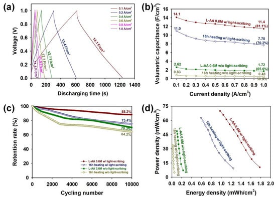 Figure 12a shows GCD curves of the MSCs prepared by heat treatment of 15 min in the presence of 0.6 M at various current densities from 0.10 to 1.00 A/cm3, and the retention rates at 0.20, 0.40, 0.60, 0.80, and 1.00 A/cm3 compared to the initial retention rate obtained at 0.10 A/cm3 were 95.0, 90.0, 87.2, 84.4, and 81.1, respectively. In addition, it was evident that the L-AA 0.6 M sample demonstrated higher rate capability than the heating 16 h sample, and the rate capability of the sample became significantly higher after the LSC process (Figure 12b). This implies that the LSC process, in the presence of optimized L-AA content, effectively retards the inevitable capacitance losses at higher currents [,,,,,]. We investigated the long-term cycling stability of the graphene MSCs by performing 10,000 charge/discharge cycles at a current density of 0.40 A/cm3 (Figure 12c). The retention rate of the L-AA 0.6 M sample (70.3%) was higher than the heating 16 h sample (64.2%), indicating that the pretreatment of GO through heat treatment for 15 min in the presence of 0.6 M L-AA was more effective in reducing the oxygenated functionalities of GO than the pretreatment of GO through heat treatment for 16 h. After the LSC process (five times), the retention rate of the L-AA 0.6 M and heating 16 h samples was 88.2 and 75.4%, respectively. This demonstrates that the presence of 0.6 M L-AA in the LSC process is more efficient in suppressing the undesirable shrinkage and delamination of the graphene sheets during the repetitive charge/discharge processes [,,,,,]. Furthermore, the GCD results also suggest that the LSC process allows the electrolytes to penetrate deeply into the underlying layers of the graphene micro-patterns []. To further examine the practical applicability of the MSCs, Ragone plots of the samples employing graphene micro-patterns prepared under different manufacturing conditions are summarized in Figure 12d. The maximum volumetric energy densities (given in mWh/cm3) of the MSCs increased in the following order: 16 h heating without LSC (0.05) < 0.6 M L-AA without LSC (0.23) < 16 h heating with LSC (1.24) < 0.6 M L-AA with LSC (1.78). The maximum power densities (given in mW/cm3) of the MSCs increased in the following order: 16 h heating without LSC (33.7) < 0.6 M L-AA without LSC (48.6) < 16 h heating with LSC (62.7) < 0.6 M L-AA with LSC (69.9). Table 2 summarizes the electrochemical performance of recent studies on light-scribed graphene (LSG) for MSCs. The electrochemical performance of the MSC obtained through this study showed superior capacitance and energy density per volume compared to previous research results. The modified LSC process proposed by our work is highly effective in improving the energy/power output of MSCs and enables facile control of the desired energy/power output [,,].