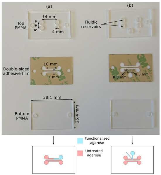 Images and detailed dimensions of the top PMMA, double-sided adhesive, and bottom PMMA used to make microfluidic devices to study (a) the electrokinetic transport and (b) electrokinetic transport-coupled biosensing.