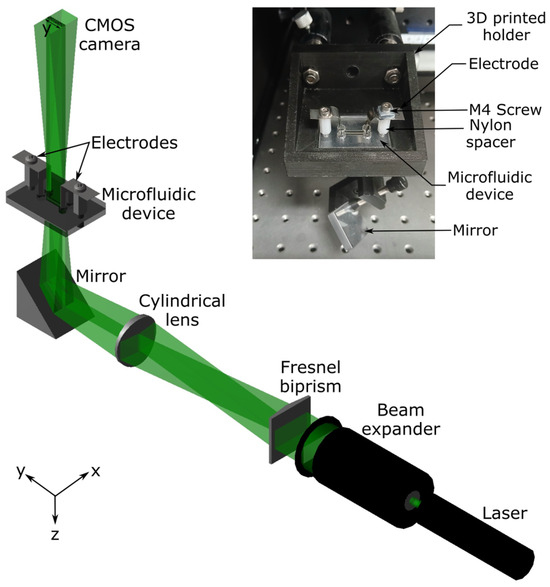 The microfluidic device was placed 120 mm away from the cylindrical lens. The l-shaped electrodes with two legs, which were made of 0.1 mm thick stainless steel sheets, were immersed in the reservoirs of the channels. As shown in the inset in Figure 2, electrodes were screwed on matching through holes in the microfluidic device using M4 screws and threaded nylon spacers (RS Components, Corby, UK).