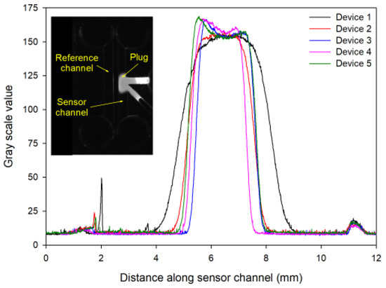 Gray scale value along the channel length for 5 microfluidic devices where the inset shows a fluorescence image of one of the devices with a 1 mm wide sensor channel filled with a plug of functionalized agarose containing fluorescein.