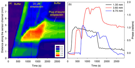 (a) Phase difference versus channel length and time, and (b) phase versus time at selected distances for streptavidin buffer.