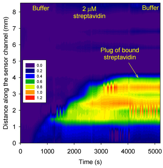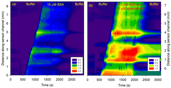 Figure 7 shows streptavidin sensing in the presence of BSA. Figure 7a shows that the phase difference increased as BSA was electrokinetically transported in the sensor channel but returned to the values observed at time = 0 after a buffer wash. Thus, BSA did not bind to functionalized biotin and untreated agarose. However, as shown in Figure 7b, if a mixture of BSA and streptavidin was electrokinetically transported, there was a permanent increase in the phase difference in the region of the sensor channel with a biotin-functionalized agarose plug.