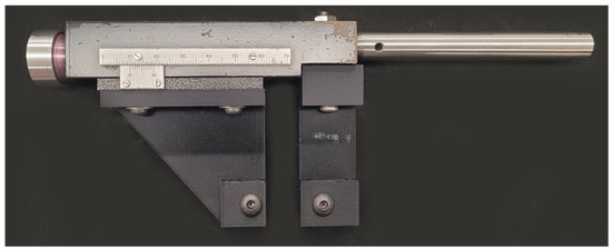An in-house-built fixture was designed and developed in the lab to apply linear strain by stretching the nanostructured PDMS sample incrementally along one axis, shown in Figure 1. The fixture applies linear strain via a side-mounted knob that moves the clamps apart linearly. The movement is measured using a linear metric scale with an added Vernier scale for more precise readings of the separation distance. To ensure the sample remains stable during data acquisition, an optical mount handle is attached to the fixture, securing it in place during experiments. Images, spectra, and data were observed and recorded as the sample was strained by the fixture at 500 µm increments. One limitation of the fixture is its ability to hold the samples under high strain (>30%), as the samples tend to release from the clamps, leading to distorted measurements. The morphology, depth, and pitch of the gratings were measured using a Dimension Edge atomic force microscope (AFM, Bruker, San Jose, CA, USA) and analyzed using the Nanoscope Analysis v2.0 software of the AFM. Optical measurements of the grating pitch change while stretching were conducted using a 5 mW He-Ne laser with a wavelength of 632.8 nm. This was carried out by measuring the change between the 0 and ±1 diffraction orders (m) used to determine the pitch according to the grating equation (), where Λ is the grating pitch, λ is the wavelength of the incident light, and is the angle of incidence.