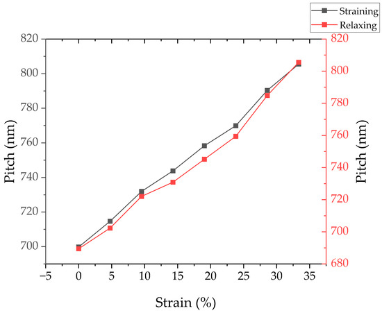 Figure 2 illustrates the alterations in pitch as the sample experiences both strain and subsequent relaxation. The initial pitch of the gratings is determined to be a value of 700 ± 1 nm. During stretching, the pitch undergoes a change of 3.2 ± 0.1 nm per percentage of strain applied. Conversely, upon relaxation, the pitch alteration is observed to be 3.4 ± 0.1 nm per percentage of strain relieved. This results in a final pitch of 688 ± 2 nm when the sample returns to its fully relaxed state.