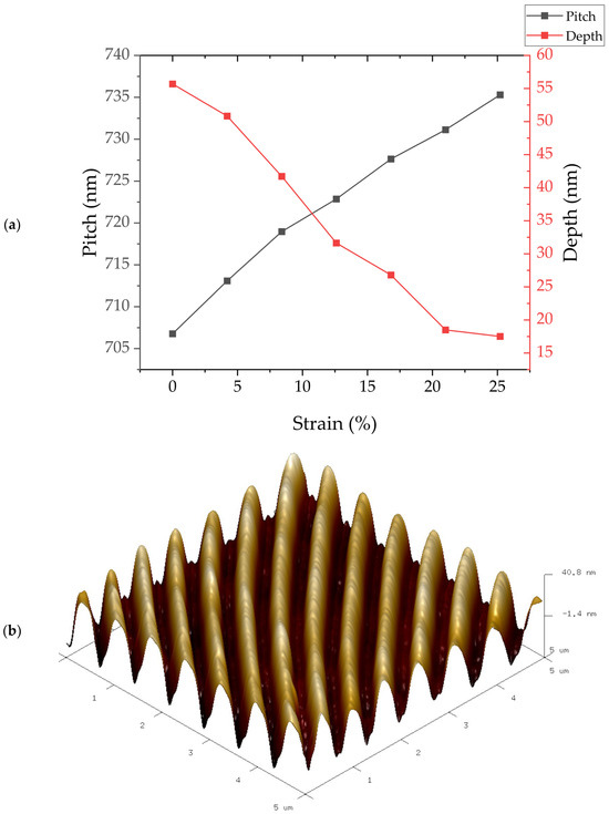 The AFM data displayed in Figure 3a confirm the expected increase in pitch with escalating applied strain. Initially, the pitch of the gratings measures 709 ± 1 nm, with a pitch increase of 1.1 ± 0.1 nm per percentage increase in applied strain. In contrast, the initial depth of the gratings is recorded as 56 ± 1 nm, exhibiting a decrease at a rate of 1.7 ± 0.1 nm per percentage of strain. These AFM scans underscore the direct influence of applied strain on the morphology of the gratings, with both pitch and depth properties serving as indicators of strain magnitude.