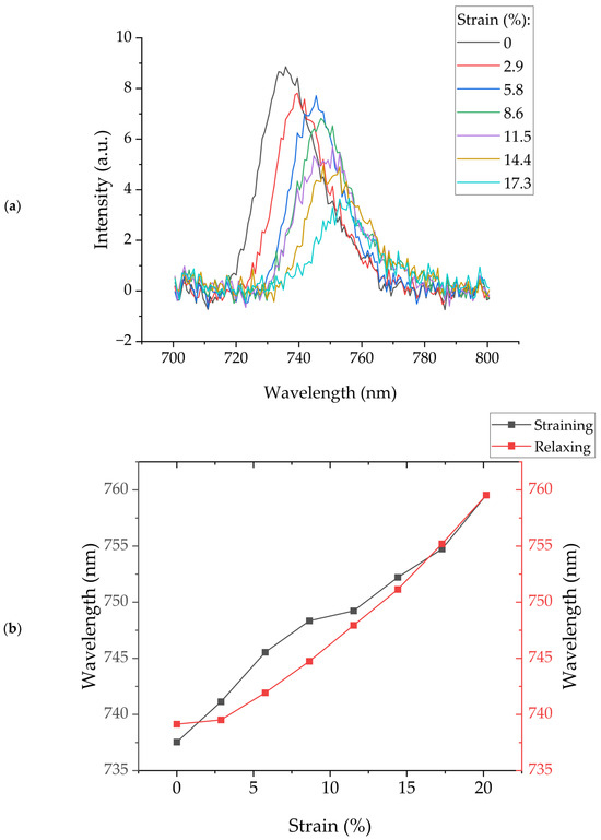 The PDMS samples were positioned in a way to align the gratings’ k-vectors parallel to the direction of strain, ensuring optimal sensitivity to the applied mechanical stress. The overall strain experienced by the sample is quantified as , where L represents the original length of the sample.