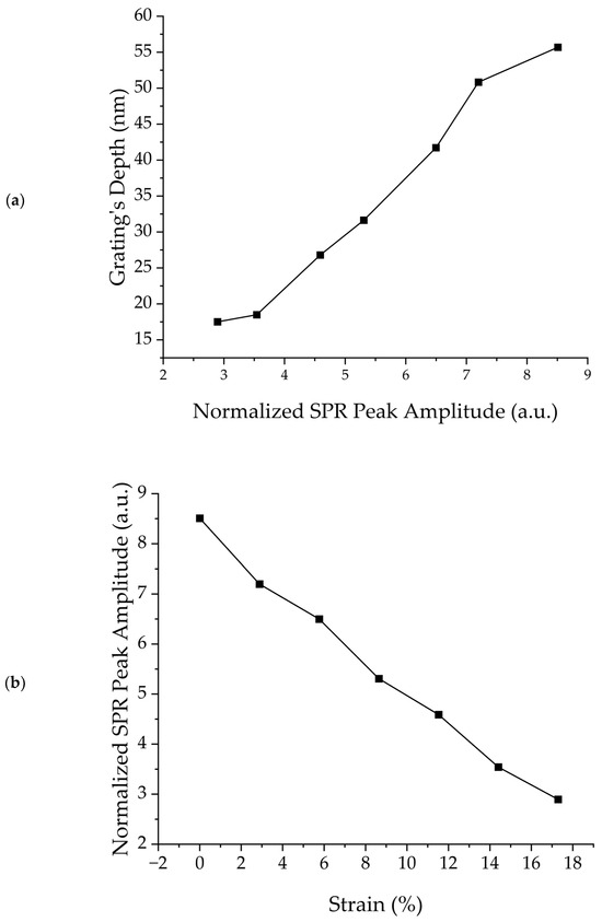Figure 5a displays the relationship between the modulation depth of the grating and the intensity of the SPR peak. As the grating depth decreases under strain, the corresponding SPR peak intensity experiences a proportional reduction. This correlation between grating depth and SPR peak intensity enables a direct means of quantifying strain, as shown in Figure 5b, where the intensity decreases at a rate of −0.32 ± 0.01 a.u. normalized.