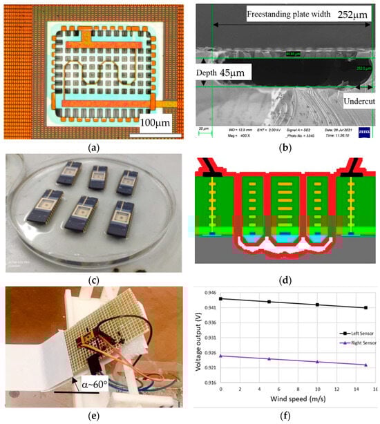 (a) Fabricated CMOS MEMS flow sensor die with orange-colored metal, light-brown-colored polysilicon and white-colored oxide; (b) SEM cross-sectional view of the sensor cavity []; (c) DIP-packaged sensor chips receiving parylene coating; (d) sensor schematic after parylene coating; (e) sensor tilting or with an inclined angle α in a wind tunnel; (f) output signals of the two half-bridged (upstream and downstream) RTDs with the same sensitivity of −138 µV/V/(m/s) [].