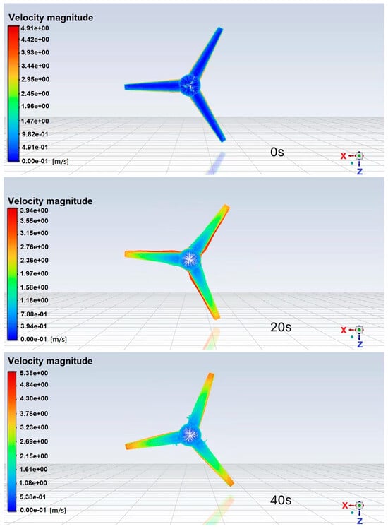 CFD simulation of an HAWT subject to 2.5 m/s freestream wind speed at 0, 20, and 40 s.