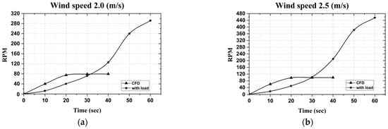 The comparison of RPM between wind tunnel testing with load and CFD according to (a) wind speed 2.0 (m/s) and (b) wind speed 2.5 (m/s).