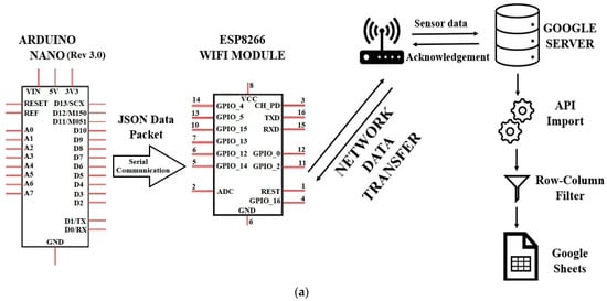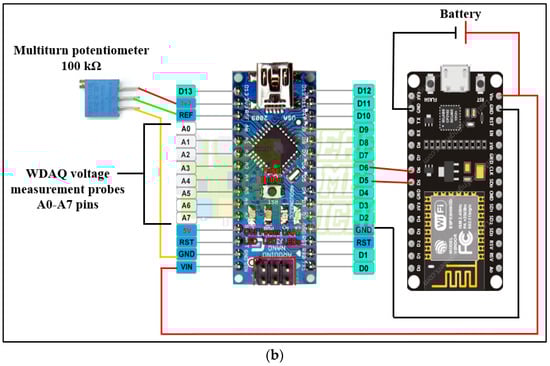 The ESP8266 is a simple and less expensive Wi-Fi module with microcontroller capability. It can easily communicate with other microcontrollers, such as Arduino (8 analog channels herein) on a 2.4 GHz Wi-Fi network. It has the advantage of connecting to Wi-Fi networks and being able to communicate with other devices remotely with ease []. By implementing the ESP8266 WiFi module, the collected data are sent as Java small object notation (JSON) from one application to another and all the data are stored structurally to avoid sending garbage data randomly to the computer. JSON is a simple format for transmitting data and helps to send the readable data in small packets []. The ESP8266 is connected to a network through which it can communicate with Google Sheets using the application program interface (API). After successful communication, a code is deployed on the Google App script to read the data from ESP8266, and the data are entered into the exact rows and columns in real time. The working process of the WDAQ is shown in Figure 4a, and a multiturn potentiometer in Figure 4b was used to adjust the reference voltage.