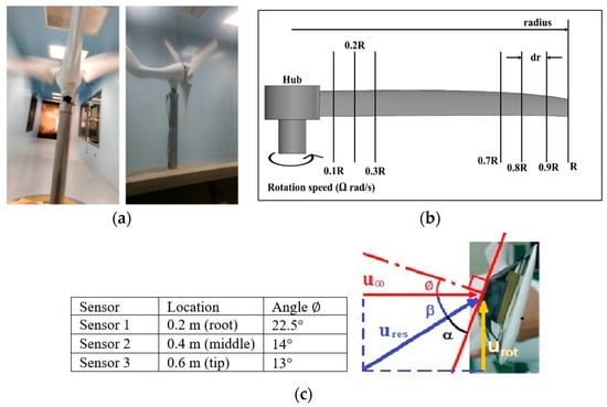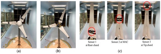 (a) Full test setup of wind turbine with CMOS MEMS sensors marked with red circles; (b) WDAQ inside the central cone; (c) CMOS MEMS sensors placed at different locations. According to the nomenclature of Figure 5, Sensor 1: 0.33 R, = 22.5°; Sensor 2: 0.67 R, 4°; and Sensor 3: 1.0 R, 3°. R = 0.6 m.