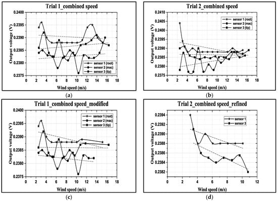 Firstly, observe Trial 1 of Figure 7a. The authors dropped the overshoot parts of Sensors 1(★) and 3(■) at the higher speed region and refined the data, as shown in Figure 7c. Sensor 3(■) at the blade tip experienced higher speeds and had lower sensitivity. However, Sensor 3’s sensitivity (−1.76 μV/1.8 V/(m/s)) was small for an air speed of up to 16.4 m/s, compared to Sensor 2(●) at the middle position, which had a sensitivity of −22 μV/1.8 V/(m/s) for an air speed of up to 15.6 m/s. Additionally, Sensor 1 had a sensitivity of −45.9 μV/1.8 V/(m/s) at the root for a drifting air speed from 15 to 15.2 m/s, as shown in Figure 7c.