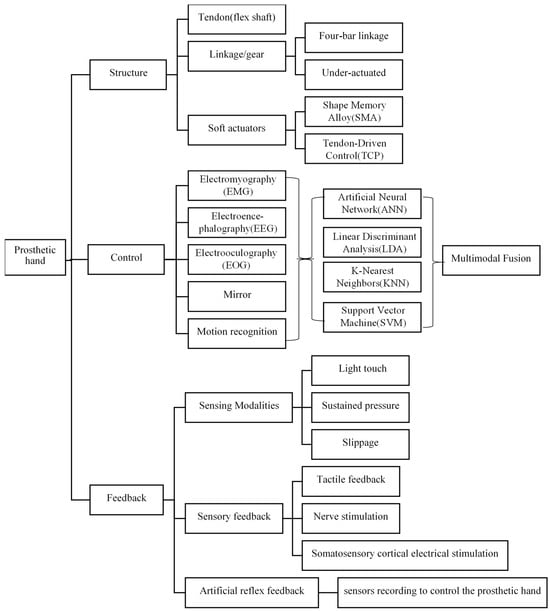 This article provides a detailed overview of the current advancements in prosthetic hand technology through extensive reviews of research from institutions, commercial product analyses, and scholarly articles. In the abstract, we expand on several aspects, systematically evaluating the progress in prosthetic hand development and detailing the classifications, comparisons, and designs of transmission mechanisms, control strategies, dimensions, and feedback techniques. Figure 2 presents a basic schematic of the topics covered in this article. The subsequent organization of this article is structured as follows: The paper begins by examining the intricacies of the human hand, covering metacarpal, finger, and thumb models. It then delves into the characteristics of prosthetic hands, discussing their size, weight, and commercial variations. Following this, various structural designs of prosthetic hands are analyzed. Control and function aspects are explored next, including main control methods, feedback mechanisms, and a functional comparison. Lastly, the discussion and conclusions sections synthesize findings and outline future implications.