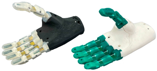 The human hand is a very precise and flexible device that plays a critical role in daily life, facilitating activities such as grasping, tactile perception, communication, and executing subtle and complex actions. The absence of a hand represents a significant physical trauma that can severely hinder an individual’s ability to perform daily tasks independently, potentially leading to unemployment and social isolation. While prosthetic limbs offer a way to restore some hand functions necessary for daily living and work, they are not always a mandatory solution, as some individuals may choose alternative adaptations. However, current prosthetic devices often lack the strength and flexibility found in natural hands. Most are capable of only limited, predefined gestures and do not fully replicate the nuanced movements of a human hand, highlighting a significant gap in design requirements. Additionally, despite advancements in prosthetic technology, the adoption rates of prosthetic hands remain low. Cost is a significant barrier, and the high-priced devices often do not deliver reliability or the ability to perform complex movements [4,5]. Well-performing anthropomorphic hands are invariably expensive, such as the BeBionic hand (Ottobock(Dudletown, Lower Saxony, Germany); approximately $11,000) and the i-Limb (Touch Bionics Inc. (Livingston, UK); approximately $18,000), prices which are unaffordable for most patients [6]. These economic factors severely limit accessibility and hinder the widespread use of advanced prosthetic technologies.