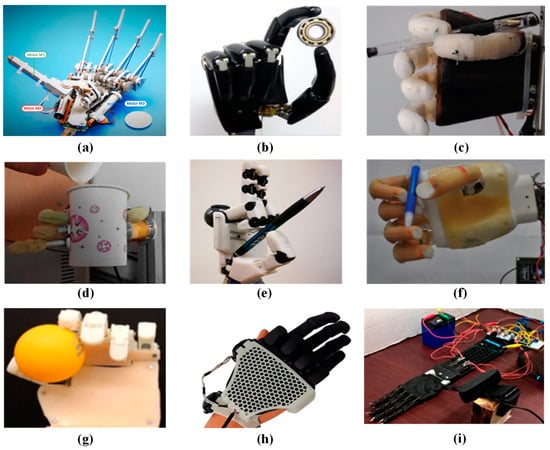 Physical image of the rest of the hand. (a) SSSA-MyHand [33]; (b) Jeong et al. [34]; (c) SoftBionic hand [35]; (d) Zhang et al. [36]; (e) Galileo hand [37]; (f) UC Softhand [39]; (g) TCP UTD hand [40]; (h) Developed prosthetic hand [41]; (i) Coiled SMA [42].