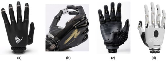 Commercial prosthetic hand. (a) Vincent Hand [44]; (b) i-Limb [3,45]; (c) Taska Hand [8,20]; (d) Bebionic Hand [3,7].